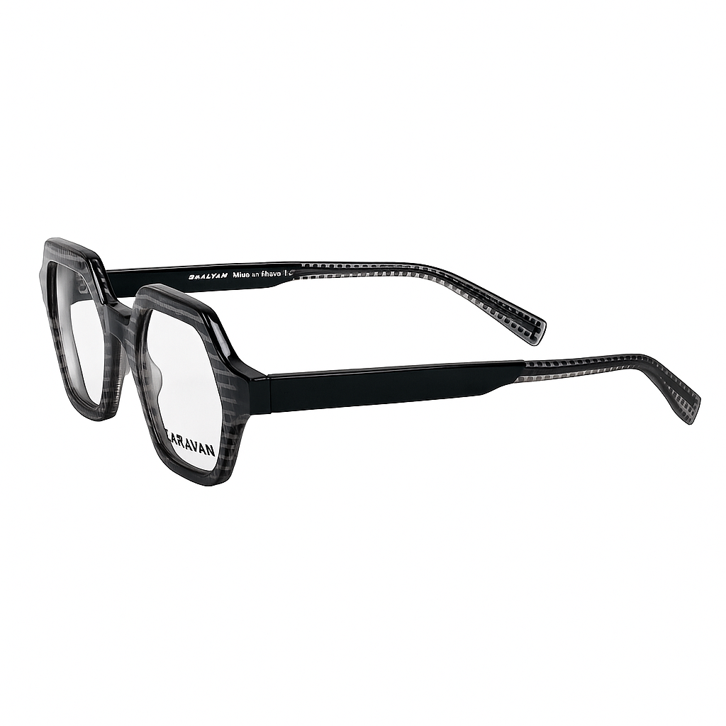 Setzen Sie ein Statement mit der außergewöhnlichen Karavan Kunststofffassung Spinelle 5 – ein Modell, das durch seine markante Ästhetik und hochwertige Verarbeitung überzeugt. Die Fassung präsentiert sich in einem grau transparenten Acetat, das eine elegante Tiefe verleiht. Das Design wird durch schwarze, quadratische Tupfen raffiniert aufgebrochen, die der Brille eine verspielte, gleichzeitig stilbewusste Note verleihen.